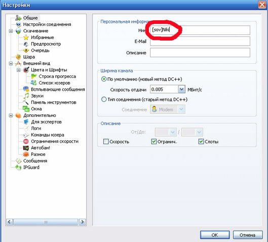 3. После установки и запуска программы заходим в настройки и указываем свой ник. В ряде регионов провайдеры требуют перед ником указать еще и район проживания. Если система требует такого и от вас, то придется указать его в квадратных скобках.