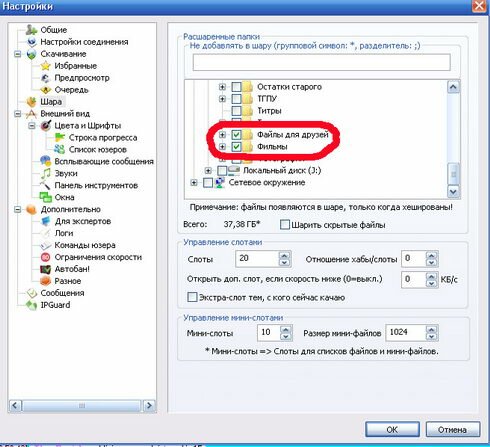 4. Теперь в настройках заходим в подпункт меню под названием «шара» и галочкой выделяем те папки, которые хотим сделать доступными для пользователей системы. У каждого хаба существует свой минимум, который вы должны расшарить, чтобы получить доступ к файлам других пользователей.