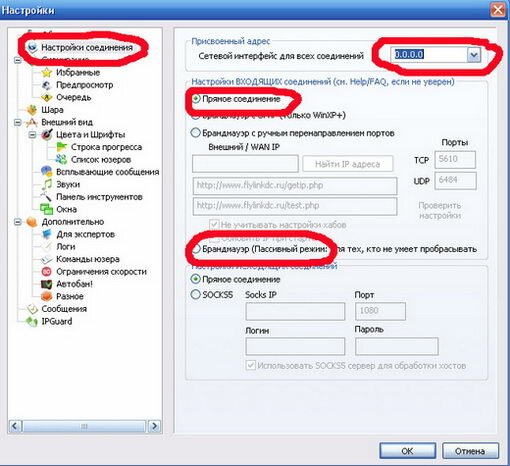 5. И последний шаг – заходим в настройки и выбираем пункт настройки соединения. Здесь нам необходимо в верхнем правом углу вписать свой IP-адрес и поставить указатель напротив прямого соединения. Если скачивание с пользователей не будет происходить, то меняем это пункт на пассивное соединение.